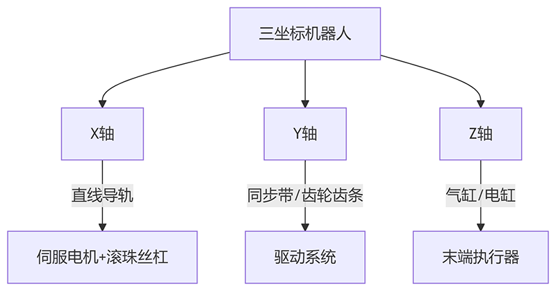 三坐标移载机器人(Cartesian Robot/Gantry Robot)是一种基于直角坐标系(X-Y-Z)运动的工业机器人,通过三个直线运动轴的组合实现高精度、高重复性的物料搬运、装配和定位作业。长沙拓亚科技的三坐标机器人系统广泛应用于自动化生产线、检测设备、机床上下料等领域。